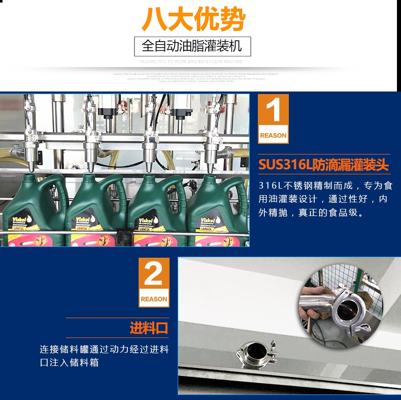 1.防滴漏灌装头由SUS316L不锈钢精制而成,专为食用油灌装设计,通过性好,内外精抛,真正的食品级.