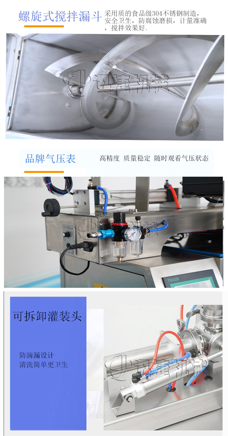 全自动立式酱料包装机适用于包装芝麻酱、食用油、洗发液、调味汁、油脂、脂膏、化妆品等产品,将其灌入袋内,能适合各种粘度的产品。该机具有快速、精确、经济和实用的优点。双系统设置,可实现酱与油的分流包装。