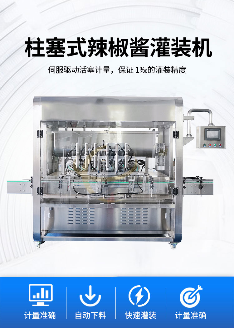辣椒酱灌装机采用活塞式灌装原理,适用于调味品中带颗粒并且浓度较大的辣椒酱、豆瓣酱、花生酱、香菇酱、果酱、牛油火锅底料。