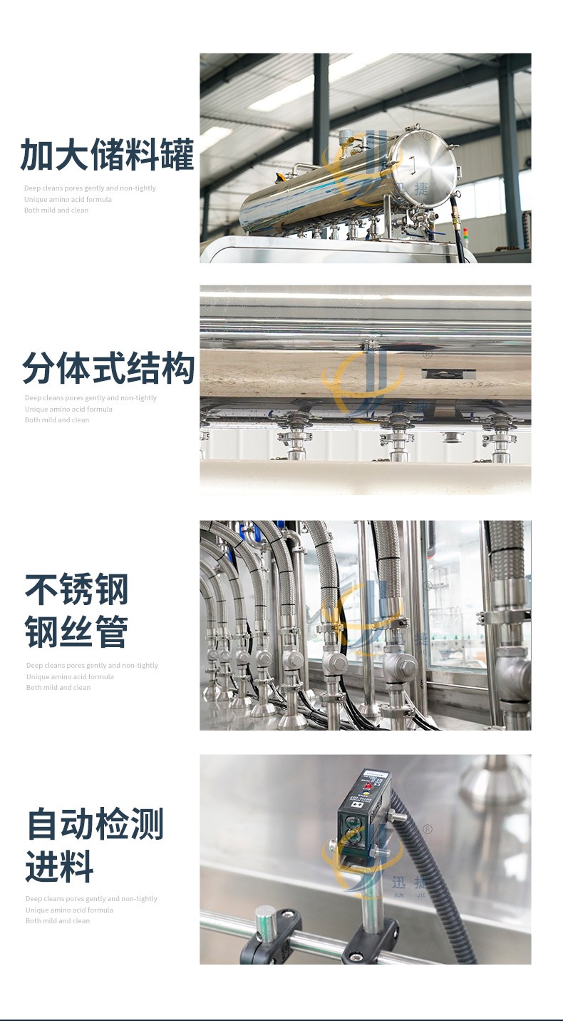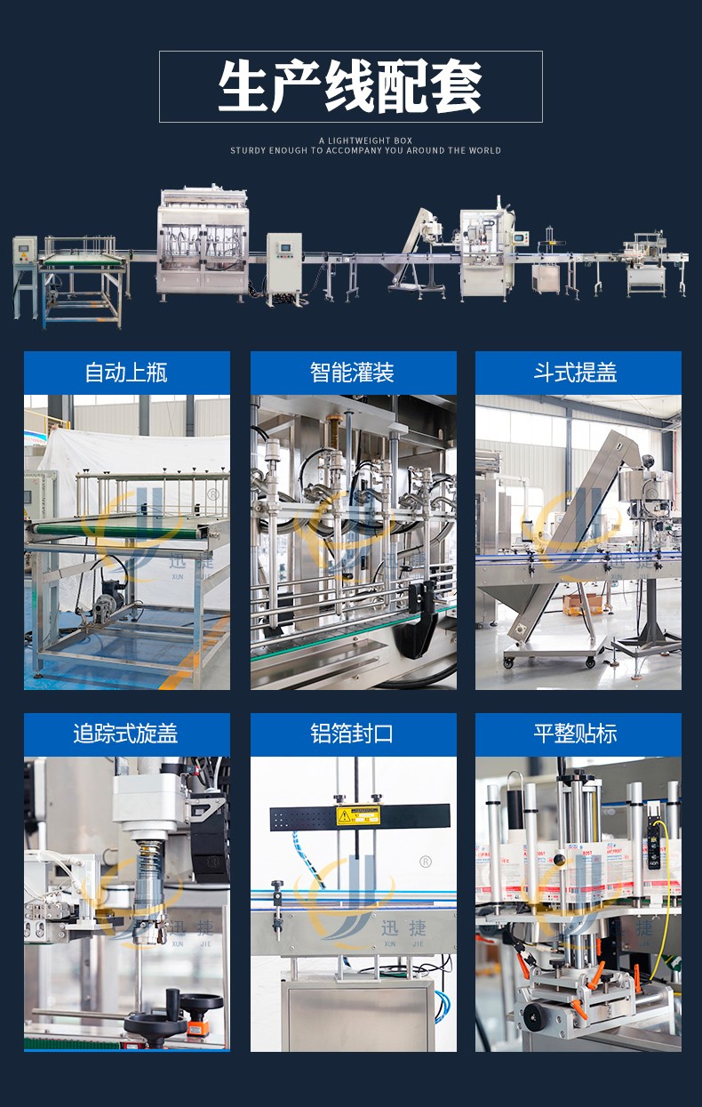 全自动液体灌装机迅捷_01.jpg全自动液体灌装机用于灌装饮料、果汁,牛奶,酒精,消毒液,口服液,洗衣液等液体,广泛应用于食品,化工,医疗等行业,灌装精密,功能强,实用性高的灌装机械。