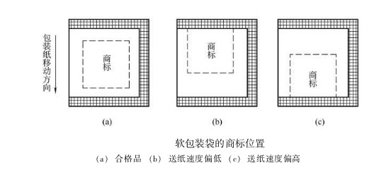 在包装作业过程中,卷筒半径逐渐减小,包装纸所受张力发生变化,送纸辊与包装纸之间的摩擦因数受环境温湿度的影响而发生波动,加上商标印刷误差,以及送纸、纵封、横封、切断各部分速度的差异等因素,使得刀辊的实际切线偏离规定部位。即使这种位置误差很小,例如在某—包装袋上只偏差0.1mm,但包装机速度很快,有的高达200包/min, 如不加以控制调节,机器运行1垃i六 后,误差积累可达20mm,切线严重偏离规定部位,降低了包装质量,甚至造成废品。如图所示,图(a)为合格品; 图 (b) 为送纸速度偏低,商标后移; 图 (c) 为送纸速度偏高, 商标前移。 为了保证包装袋的正确封切, 必须在卷筒纸供送系统中, 引人商标图案自动位置检测与控制系统。目前应用广泛的是光电自动定位系统。