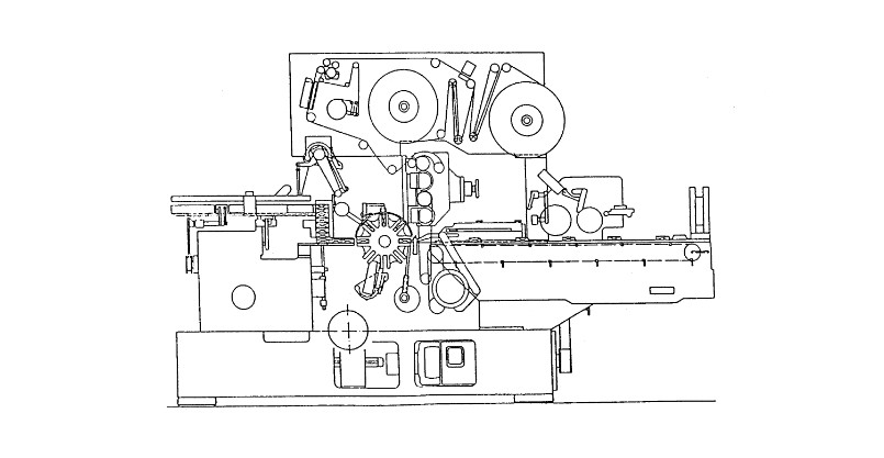 (二)机械传动 401型小包薄膜包装机由立励磁的直流分路绕线式电机提供驱动力。主电机 (2)通过定时皮带 (3)带动主传动轴 (1),主传动轴 (1)将动力分配成5路。 主传动轴上的齿轮系 (10)传动轴 (15),轴 (15)通过伞齿轮体 (12)带动定时皮带 (11)。定时皮带 (11)驱动分离轮 (13)和传送轮 (14)2路 ,主传动轴上的锥齿轮副 (8)带动偏心圆盘 (16)和连杆 (17),拖动行走架 (18)和输人推送器 (19)作往复直线运动。